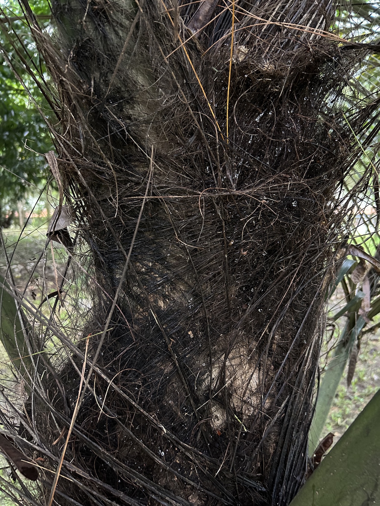 - Bentuk Pohon: Palem tunggal berukuran besar dengan batang tegak lurus, tidak bercabang, seringkali ditutupi oleh serat hitam kasar dan sisa-sisa pelepah daun.