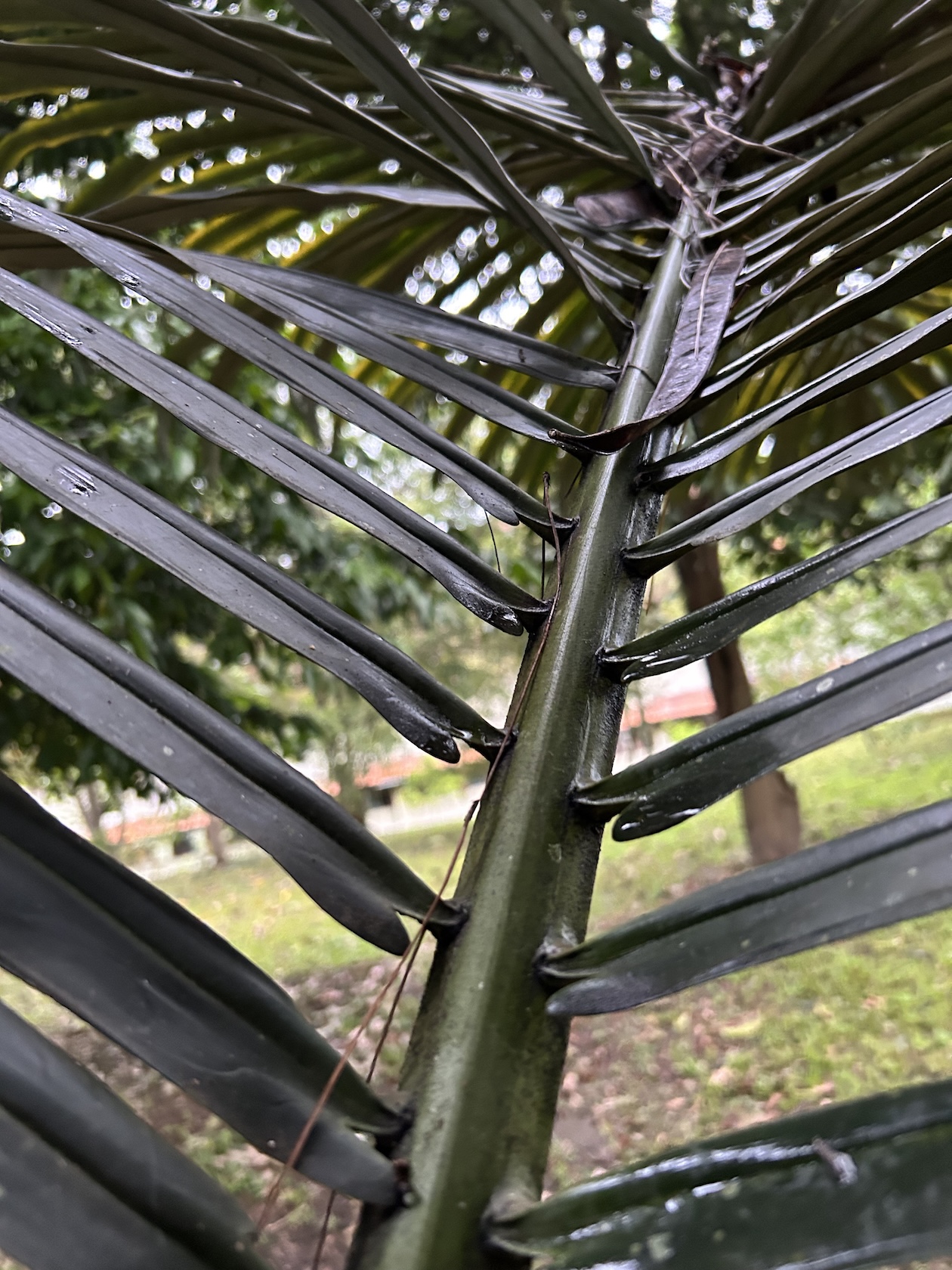 - Daun: Majemuk menyirip (pinnate), sangat besar, panjangnya bisa mencapai 6-12 meter. Anak daunnya panjang, ramping, berwarna hijau gelap di bagian atas dan putih keperakan di bagian bawah. Daun-daun tua seringkali terkulai ke bawah.