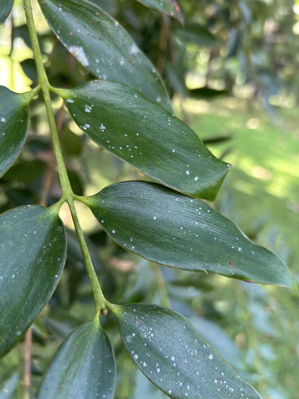 • Keunikan Daun: Daunnya tidak berbentuk jarum seperti kebanyakan konifer lainnya, melainkan lebar dan pipih. Namun, bijinya tetap dihasilkan dalam kerucut (cone).
