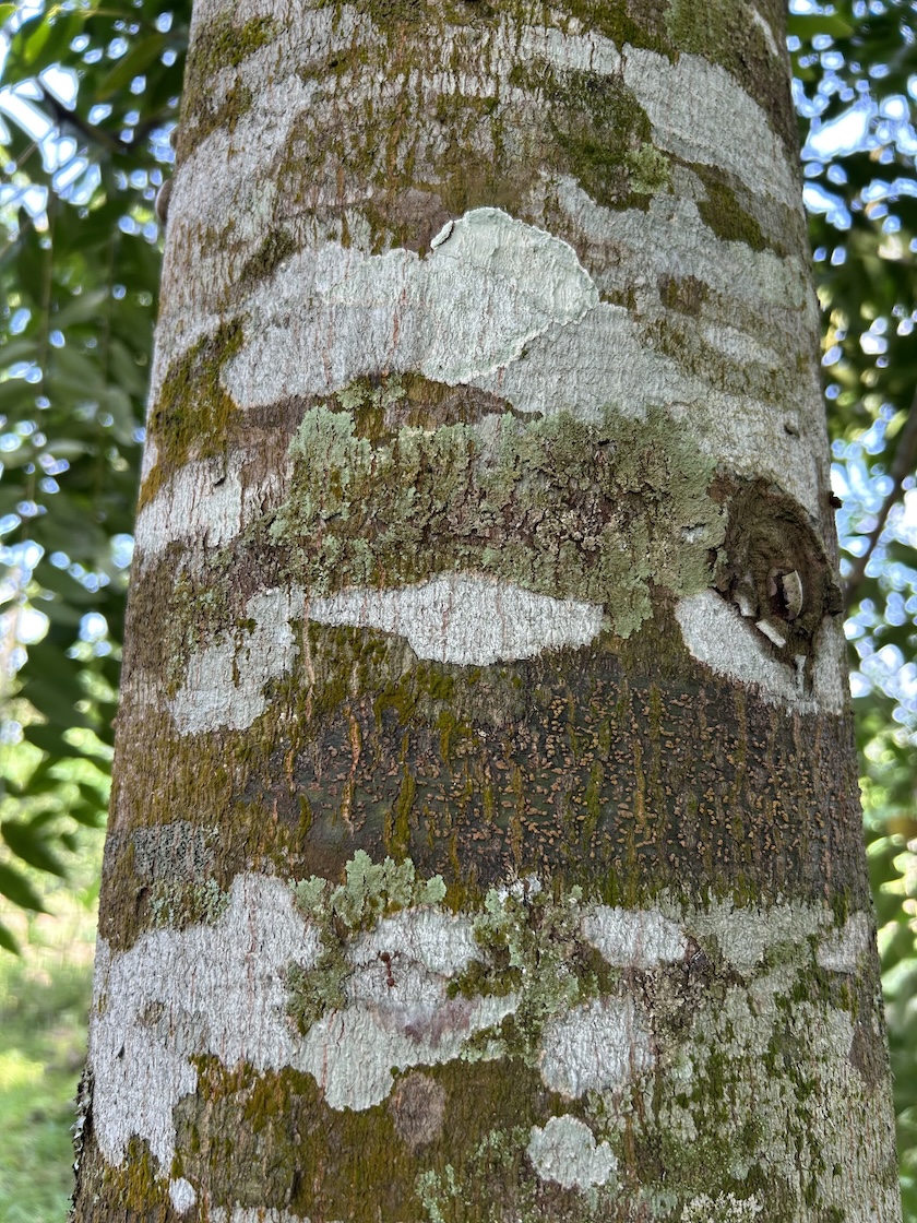 • Batang: Kulit batang berwarna abu-abu kecoklatan, licin pada pohon muda, dan kemudian pecah-pecah atau mengelupas tidak beraturan pada pohon tua. Seringkali mengeluarkan getah atau resin bening kekuningan (disebut damar).