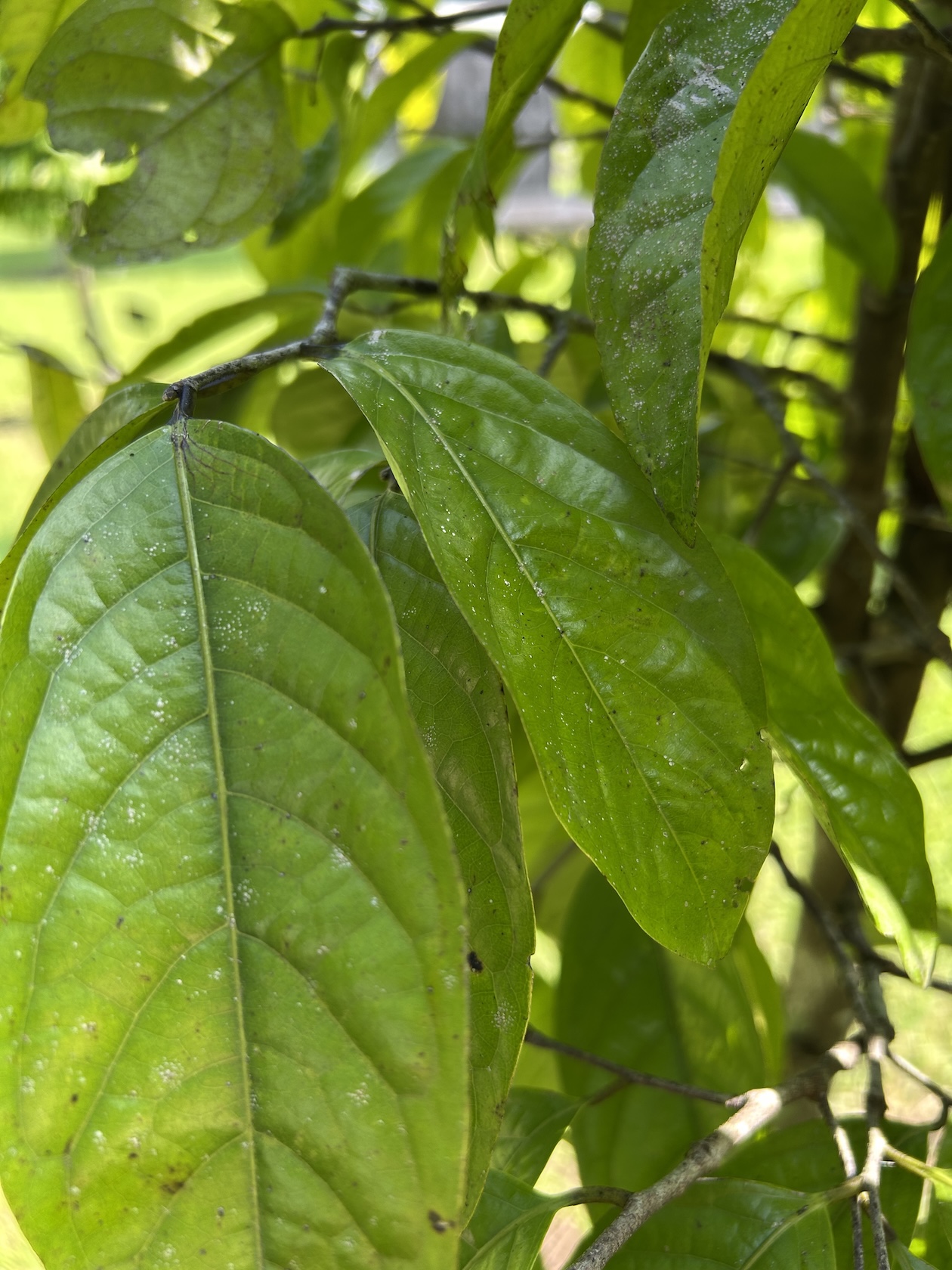- Daun: Tunggal, berwarna hijau gelap mengkilap, berbentuk lonjong sampai elips dengan ujung meruncing. Daun muda seringkali berwarna merah muda terang yang sangat menarik.