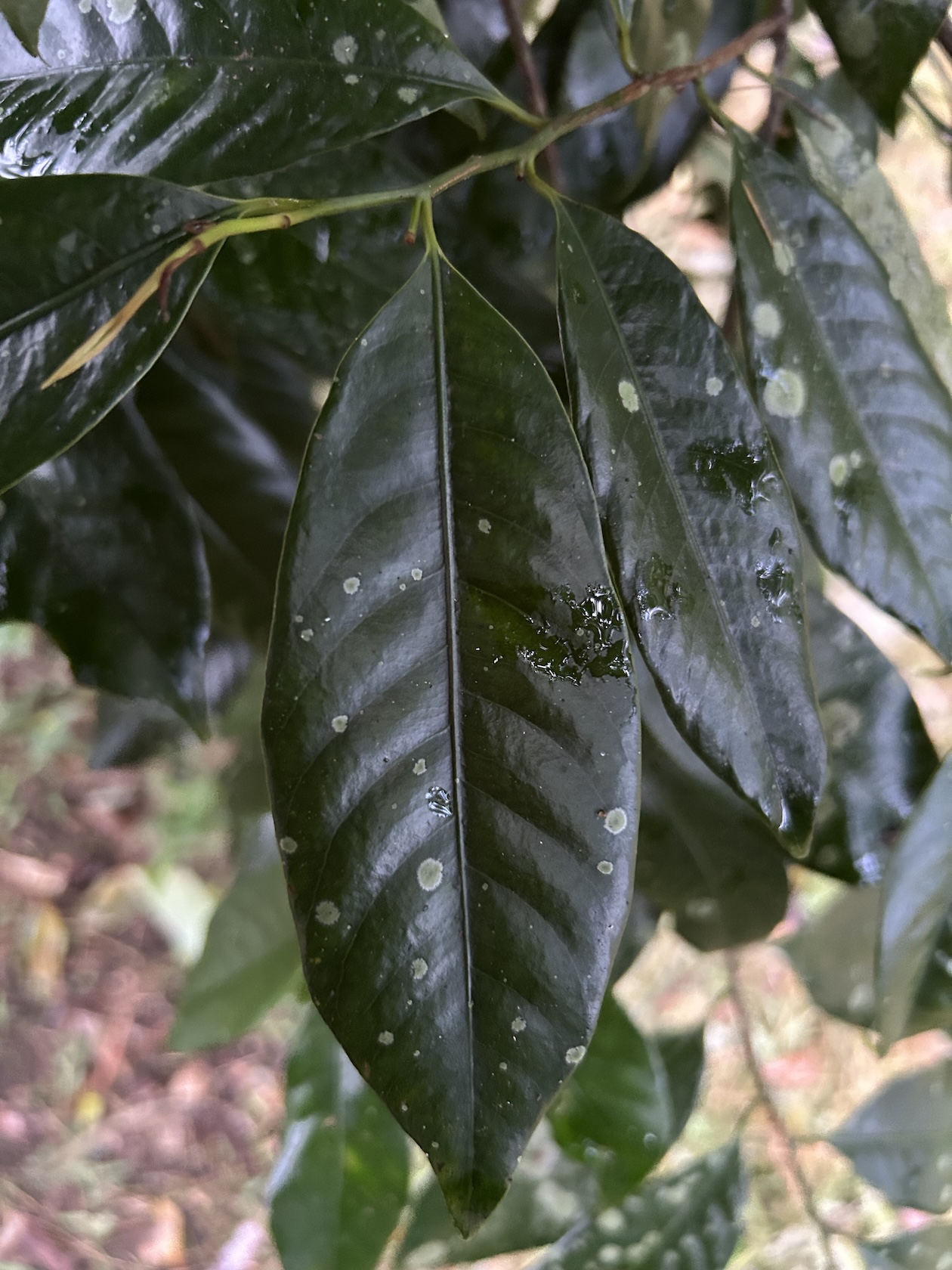 • Daun: Tunggal, berbentuk lonjong hingga elips, dengan ujung meruncing. Berwarna hijau gelap mengkilap di bagian atas, dan lebih pucat kebiruan di bagian bawah. Daunnya tebal dan beraroma jika diremas.