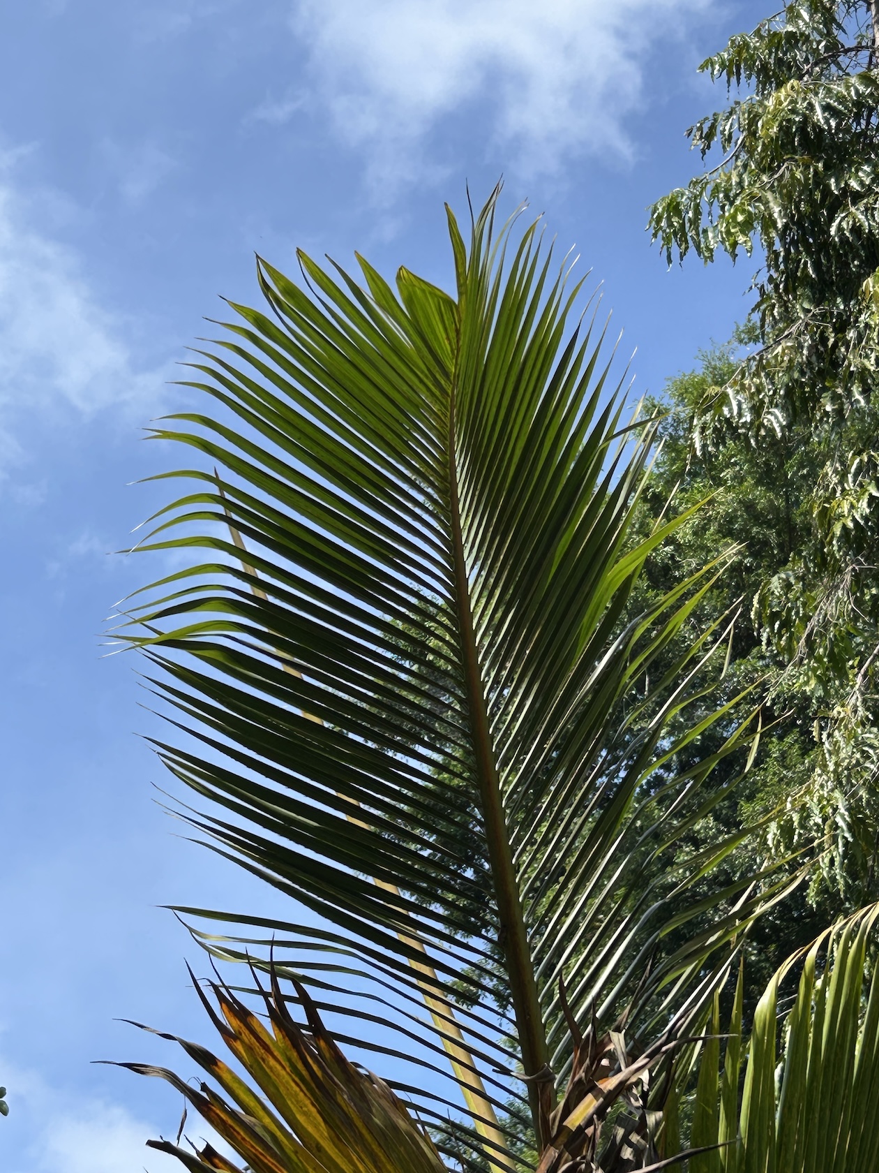 - Daun: Majemuk menyirip, melengkung anggun, berwarna hijau gelap, dan panjangnya bisa mencapai 2-3 meter. Daun-daun ini tumbuh membentuk mahkota di puncak batang yang ramping.